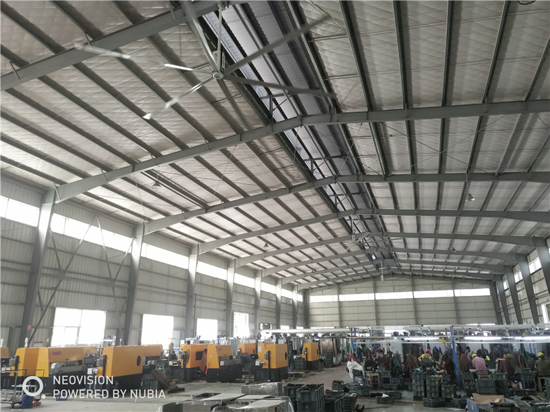 車間面積通常較大,空間高度較高,整個室內(nèi)的空間體積巨大,室內(nèi)空氣流通不暢,夏季鐵皮屋面因日照吸熱,加之室內(nèi)一般都存在一定的熱源(發(fā)熱設(shè)備),故通常均不同程度存在著生產(chǎn)工作環(huán)境高溫悶熱的問題。而華南地區(qū)熱季周期較長,環(huán)境問題尤為突出,再者,近年來各企業(yè)普遍面臨著招工難、難留人的用工問題困擾,找到良好的廠房車間通風(fēng)降溫解決方案,并進(jìn)行環(huán)境改善,已越來越迫切。 典型的鋼結(jié)構(gòu)廠房車間工業(yè)風(fēng)扇,工業(yè)吊扇大風(fēng)扇通風(fēng)降溫解決方案如下 工業(yè)大型風(fēng)扇供應(yīng)商/大型工業(yè)風(fēng)扇廠家/工業(yè)大風(fēng)扇應(yīng)用領(lǐng)域: